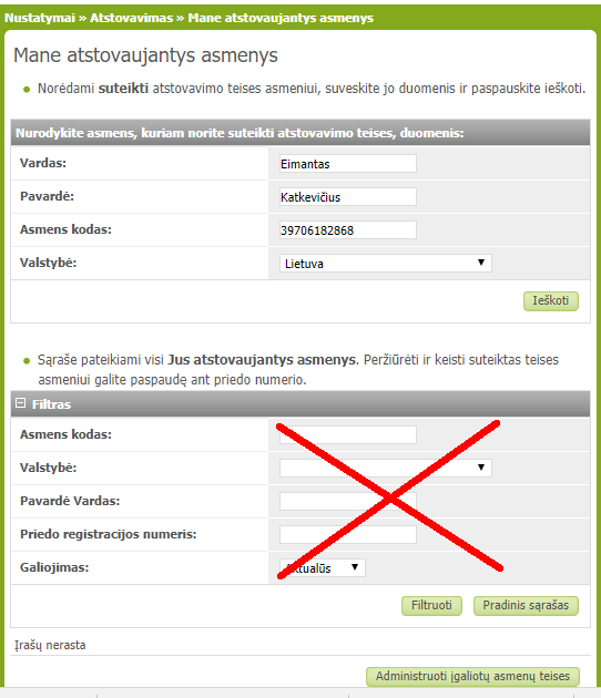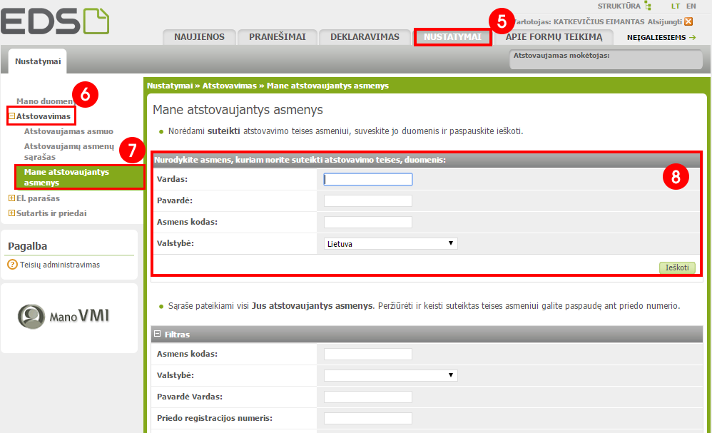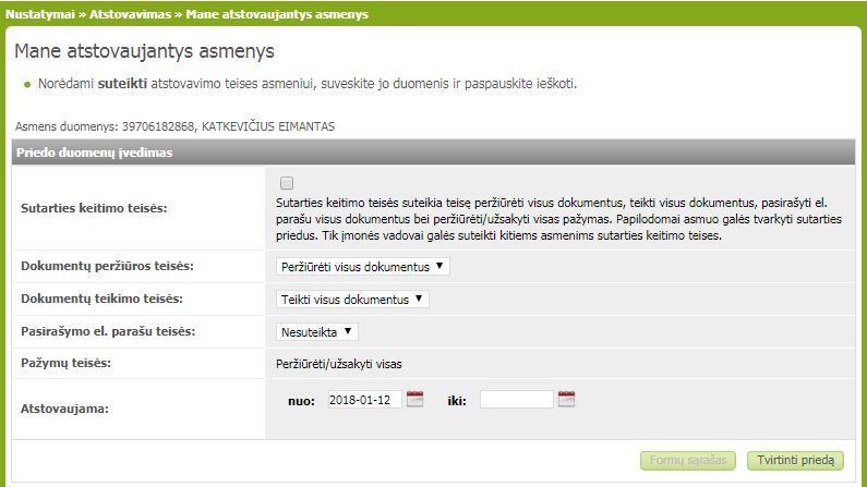 3. Kiek žemiau spausti Mane atstovaujantys asmenys (7) ir pildant viršutinę formą (8) mūsų darbuotojui suteikti atstovavimo teises. Mūsų atstovo duomenys pateikti žemiau.