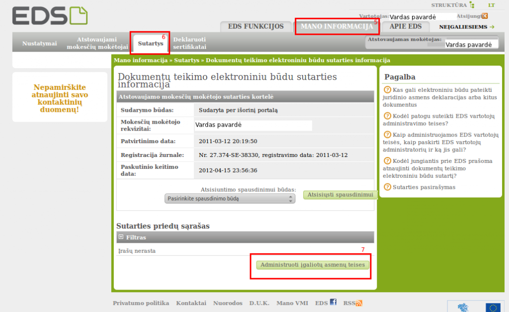 3. Apačioje spausti Administruoti įgaliotų asmenų teises (7).